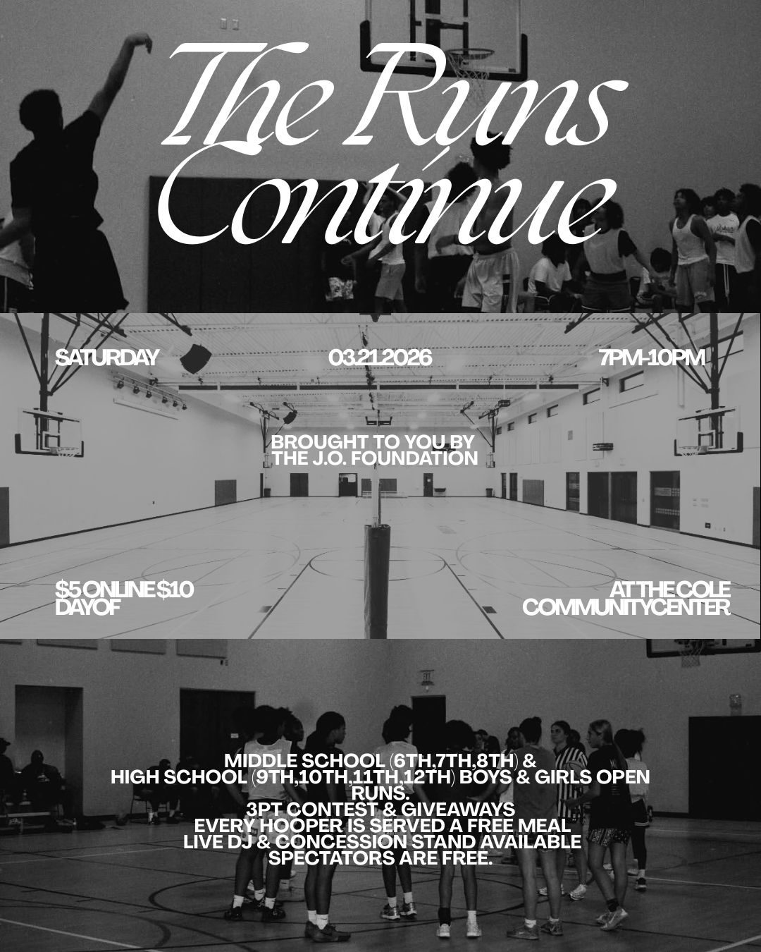 Open runs for middle and high school athletes featuring 3pt contest, live DJ, certified referees, giveaways, and a free meal for every hooper.